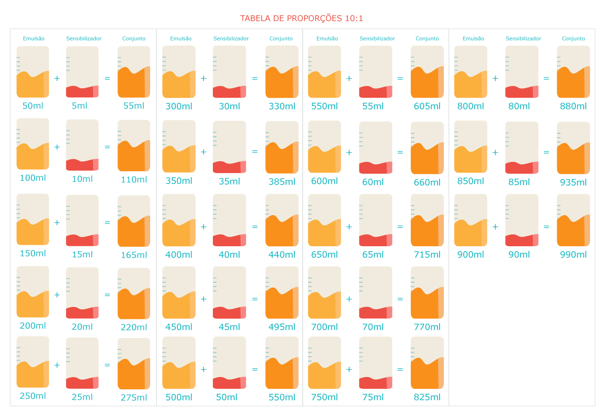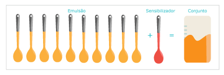 Dicas da Camilinha:às vezes, lidar com proporções nos traz certa dúvida, não é mesmo?! Mas é simples! Vamos aplicar na prática o caso em questão: 10 partes de emulsão para 1 parte de sensibilizador. Se optarmos utilizar colheres como referência, para cada 10 colheres de emulsão, agregaremos 1 colher de sensibilizador: